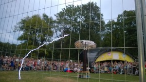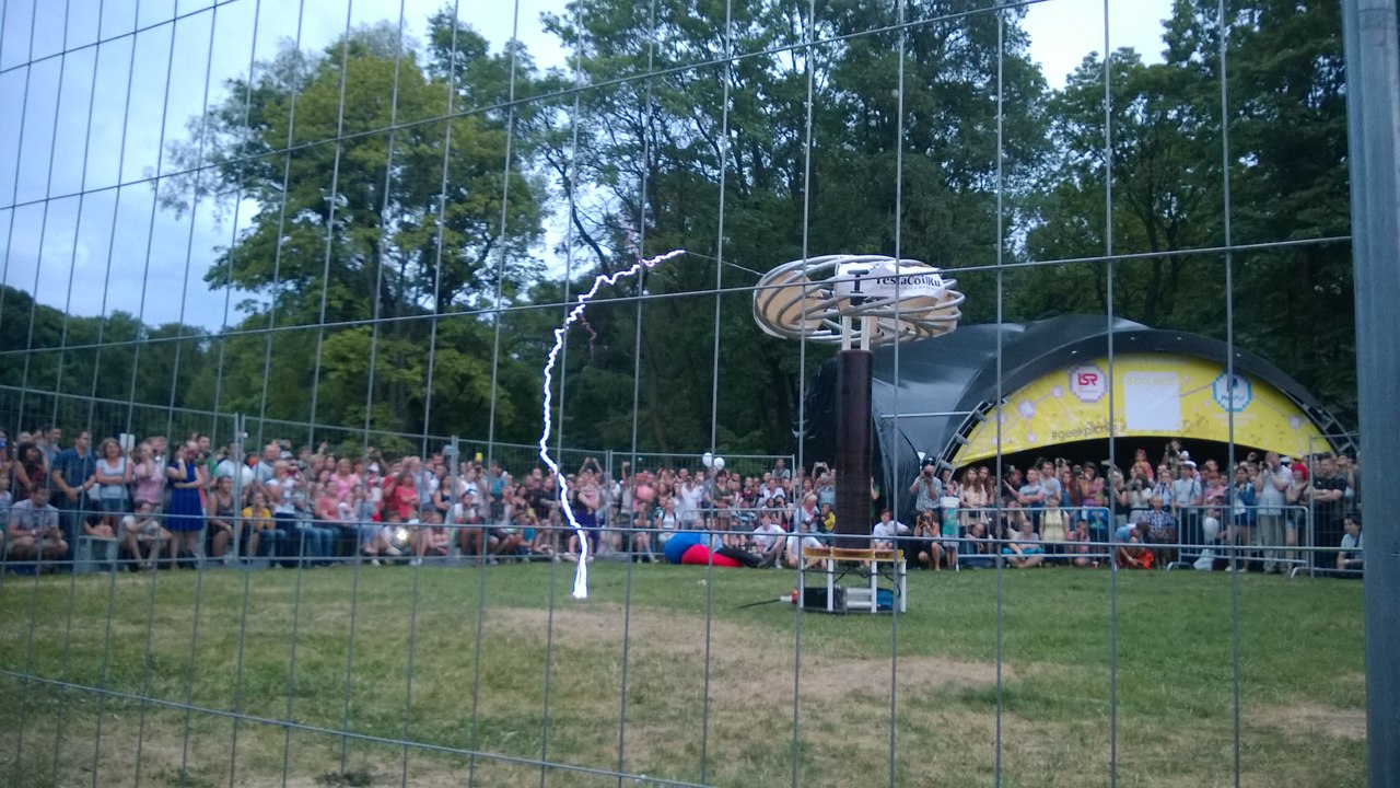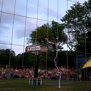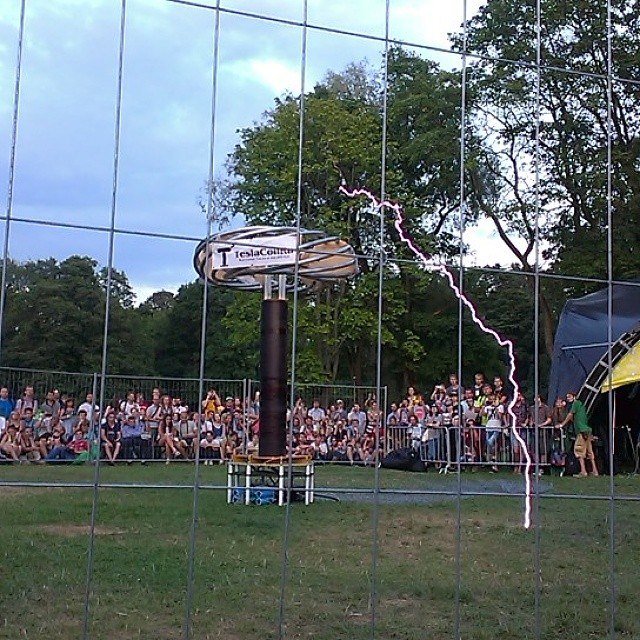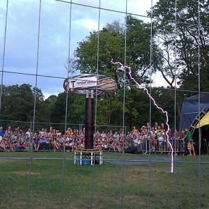В этот раз мы запустили на фестивале самую большую работающую катушку Тесла в РФ (модель DR4, проектное название «Silantor»), с длиной разряда 6 метров и более, продемонстрировав её работу в импульсном режиме и в музыкальном, исполнив несколько узнаваемых мелодий — «Шторм» Вивальди, темы из Марио и Тетриса.
