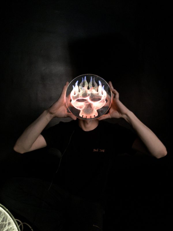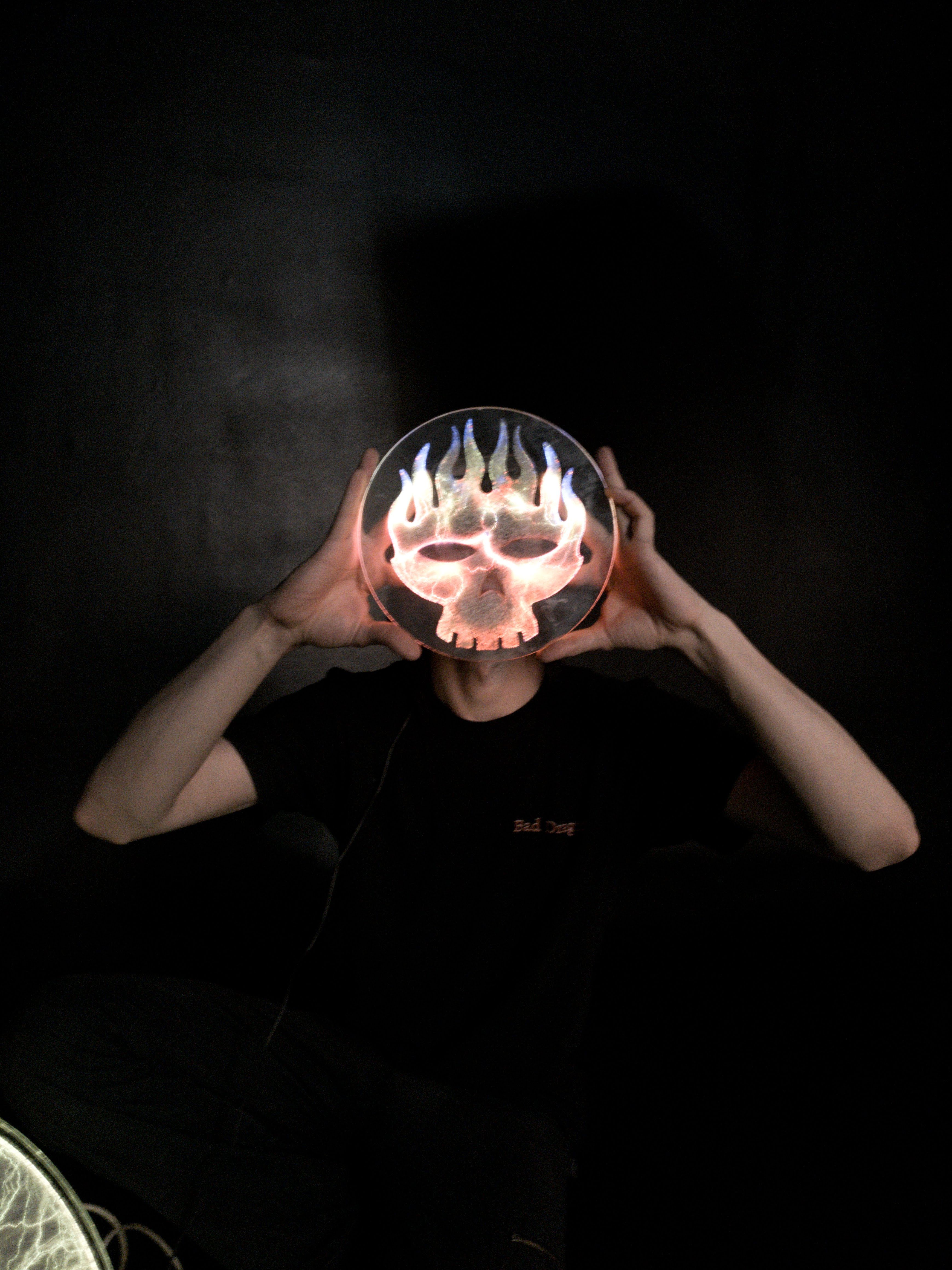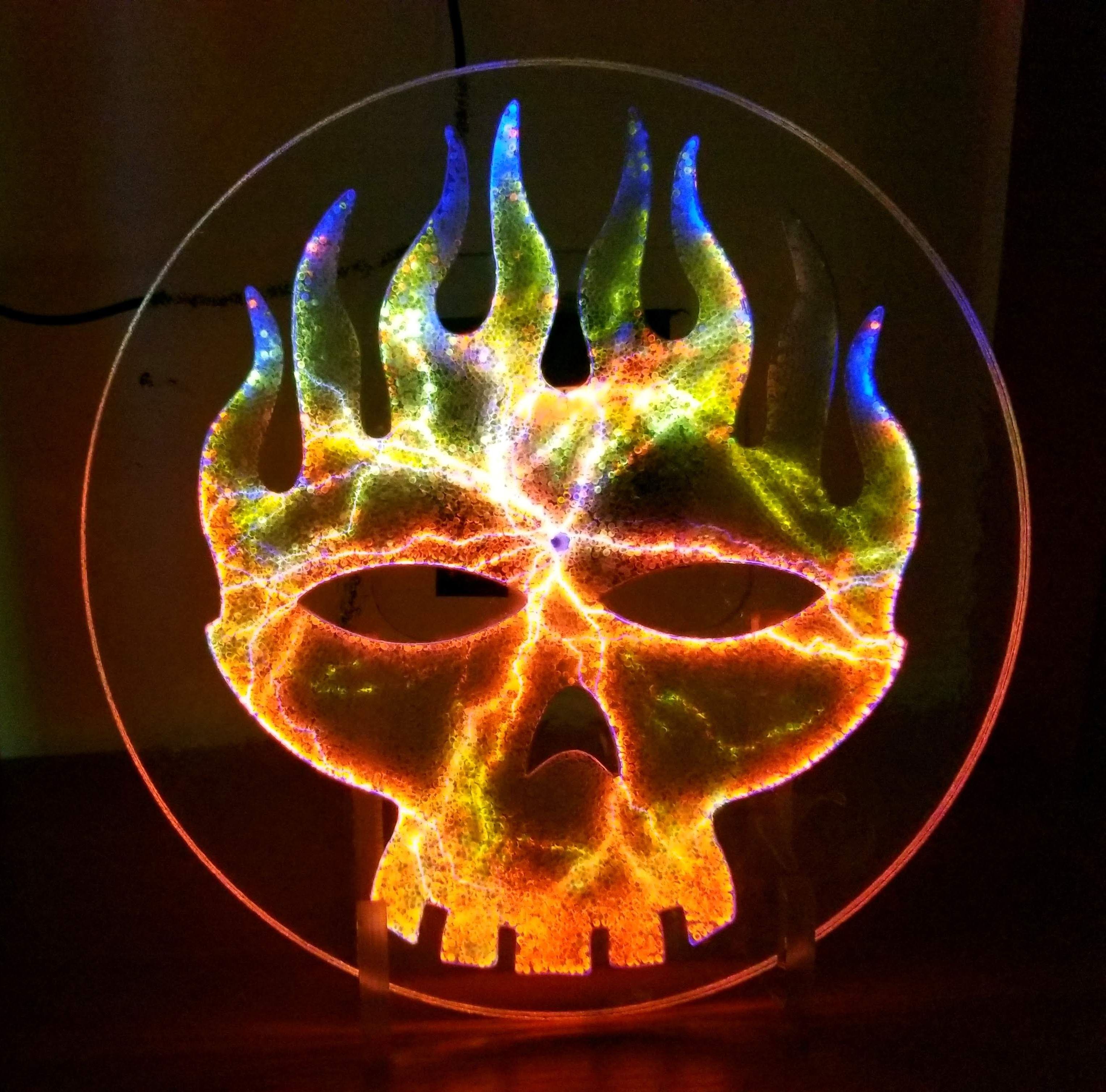 Танцующие языки пламени в черепе — пугает, завораживает, но точно не оставляет равнодушным. Самый необычный настольный аксессуар. Цветные молнии, замкнутые в картине.