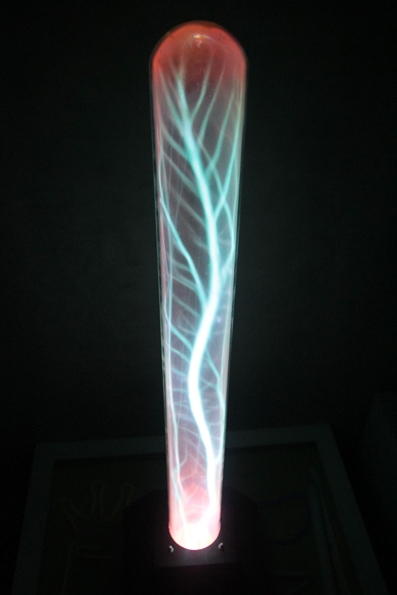 Плазменная труба с голубым свечением, напоминающим перья или языки пламени, и красными хвостами разряда, а также красными точками в местах касания пальцев. Спокойная и яркая. Работает от всех катушек Тесла, начиная с Е1 и мощнее.