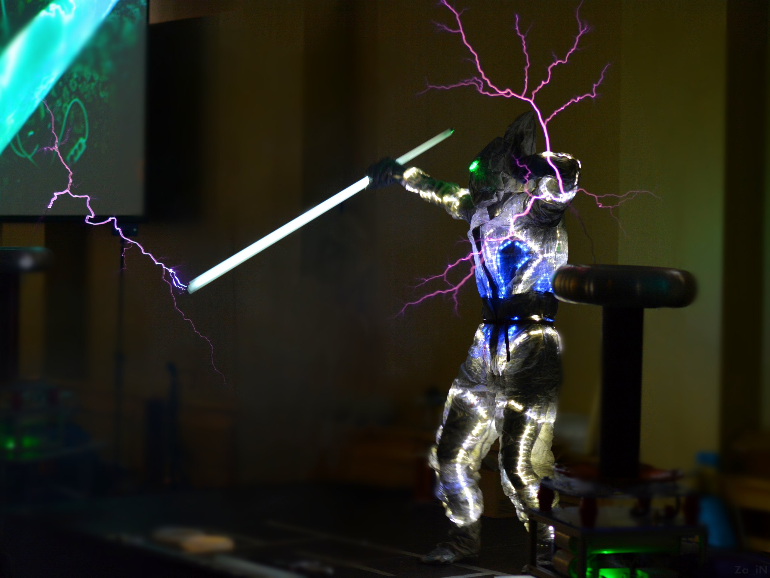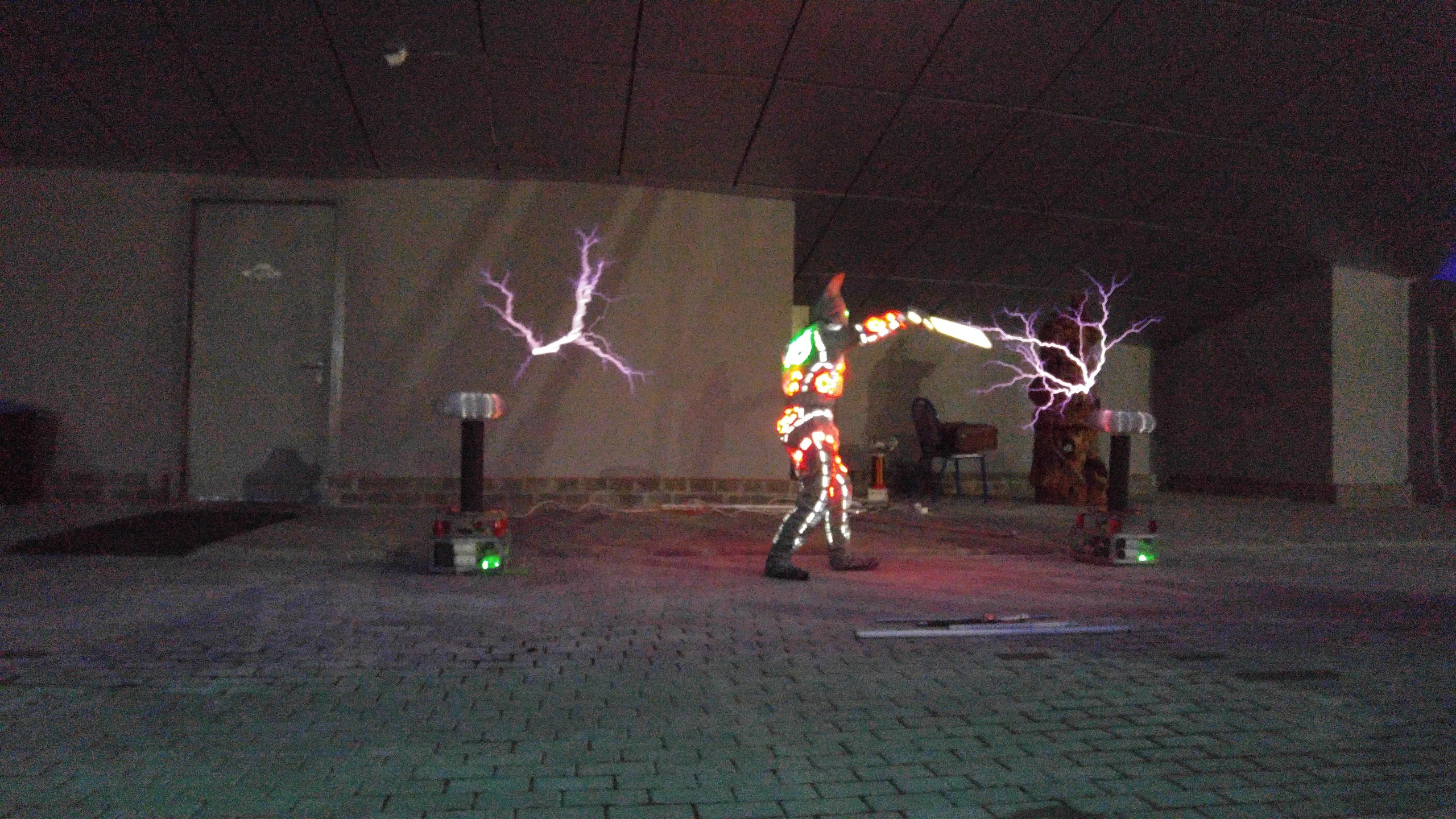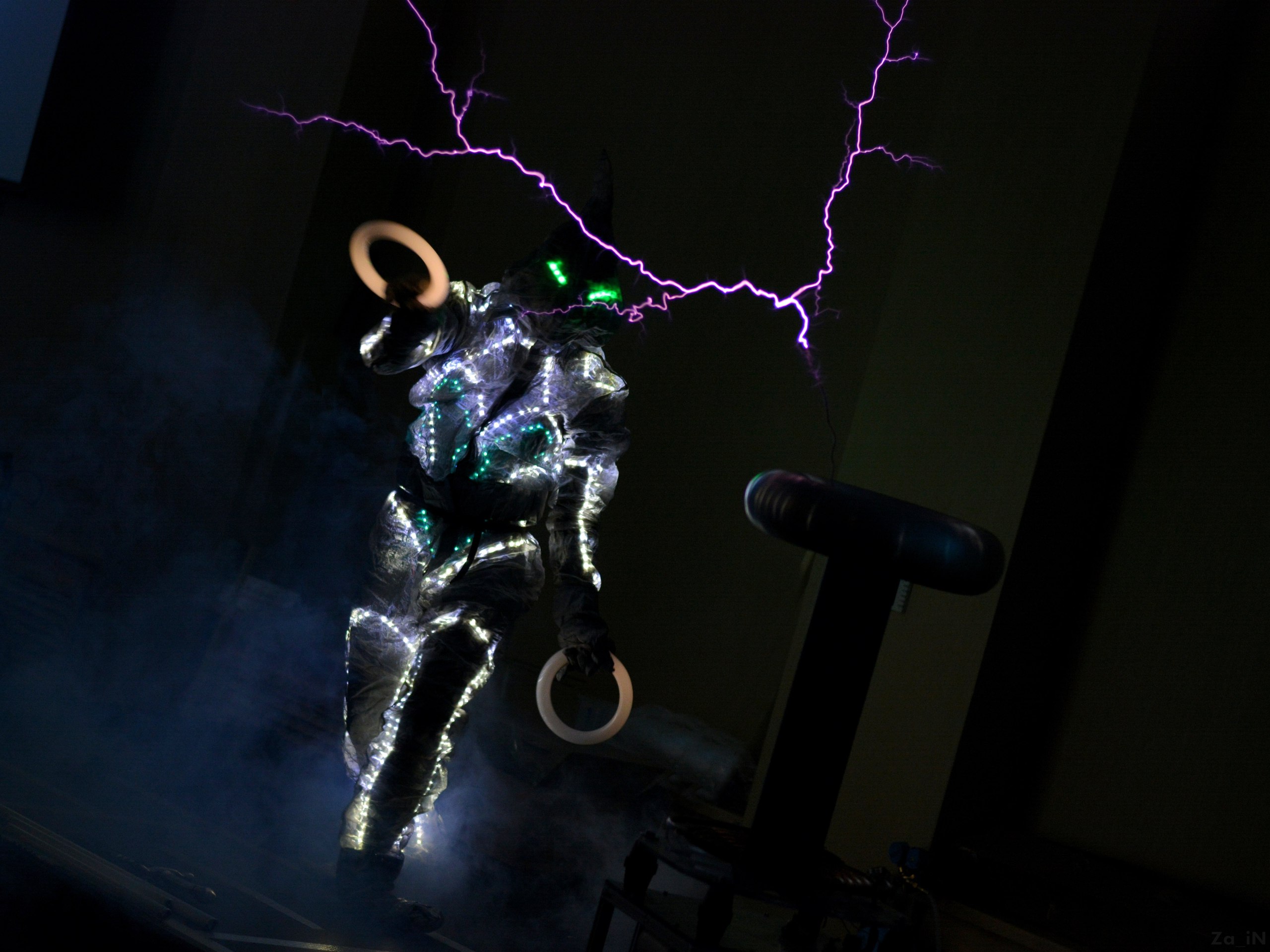 Комплект для запуска полноценного музыкального Тесла-шоу включает в себя две катушки Тесла модели DR1 с длиной разряда до 1,5 метров каждая, поддержкой музыкальной модуляции разряда через MIDI с управлением с ноутбука, а также молниезащитный костюм для артиста. Владельцы данного комплекта успешно работают в Калининграде, Краснодаре, Москве, Сочи, и других городах России — присоединяйтесь и Вы!