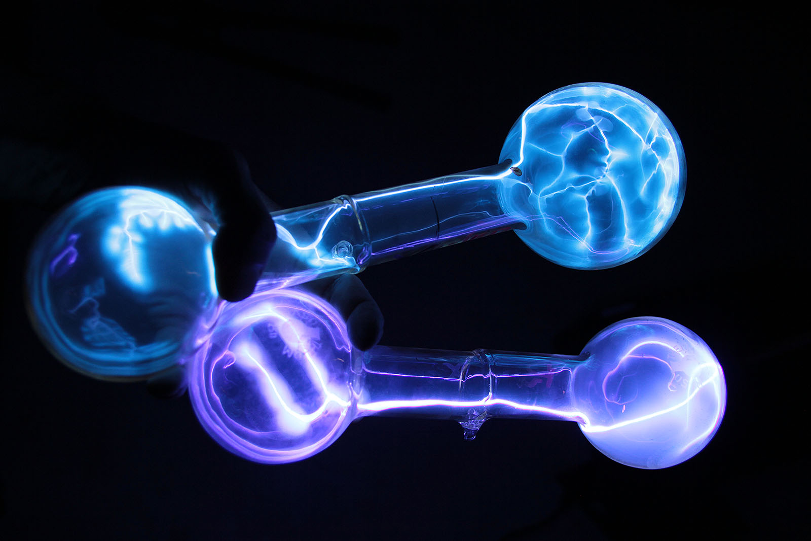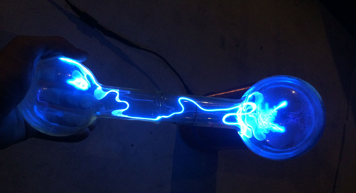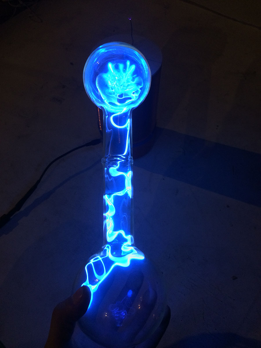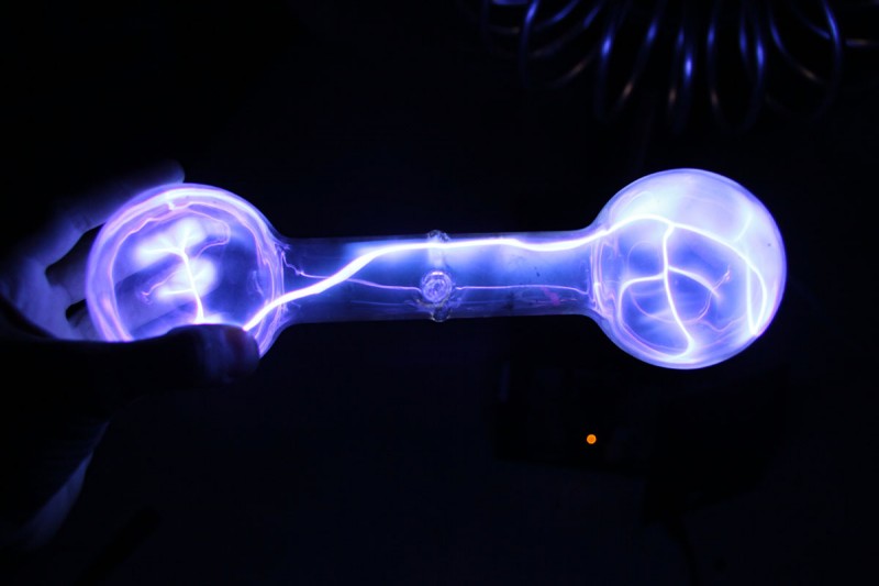 Плазменная гантеля — плазменный шар необычной формы, напоминающий обычную гантелю для тренировки. Создаёт необычные спецэффекты, рекомендован к приобретению вместе с крупными катушками Тесла. Цвет синий. Размер шариков гантели — по 500 мл.