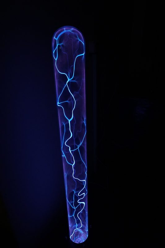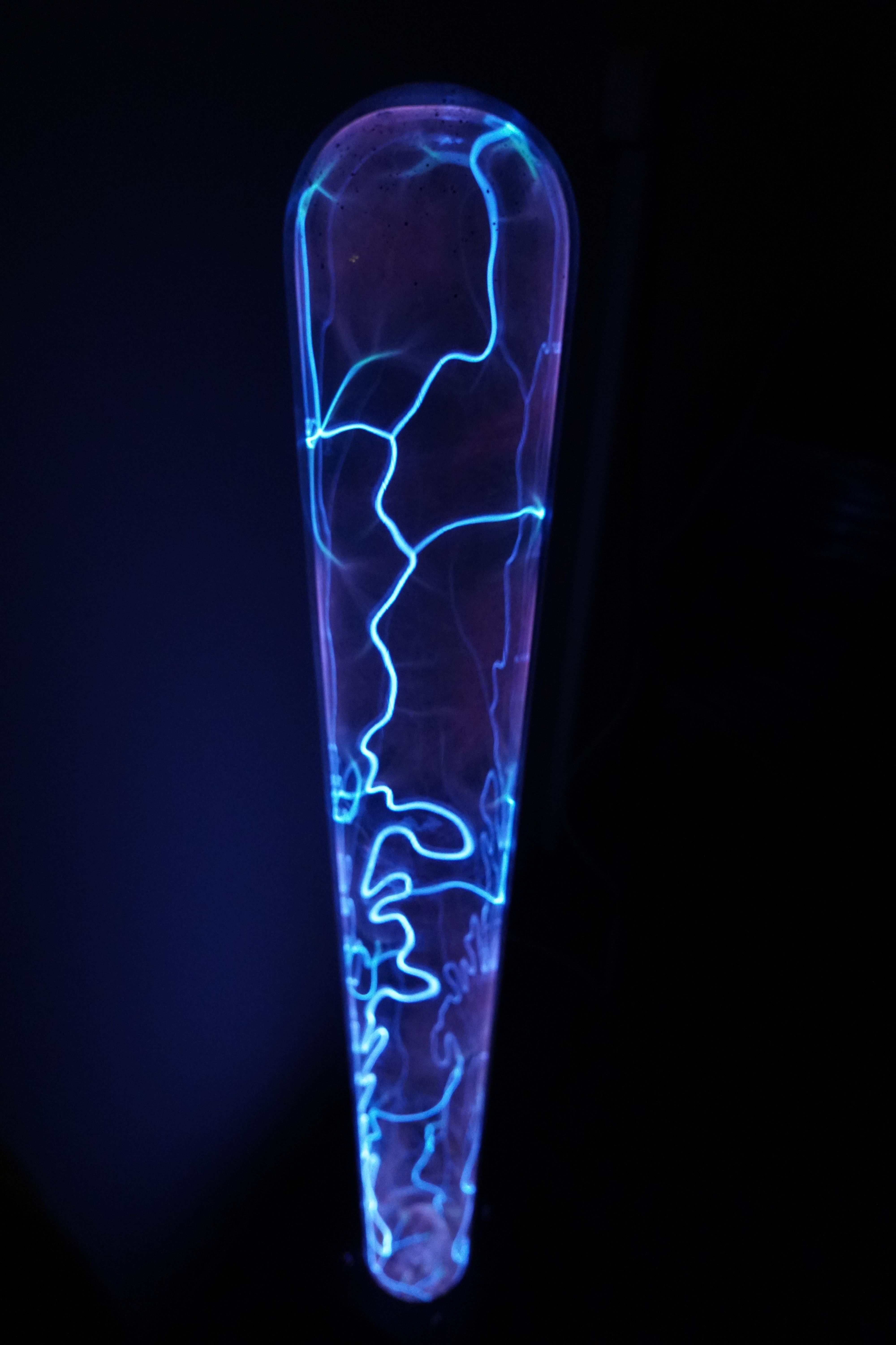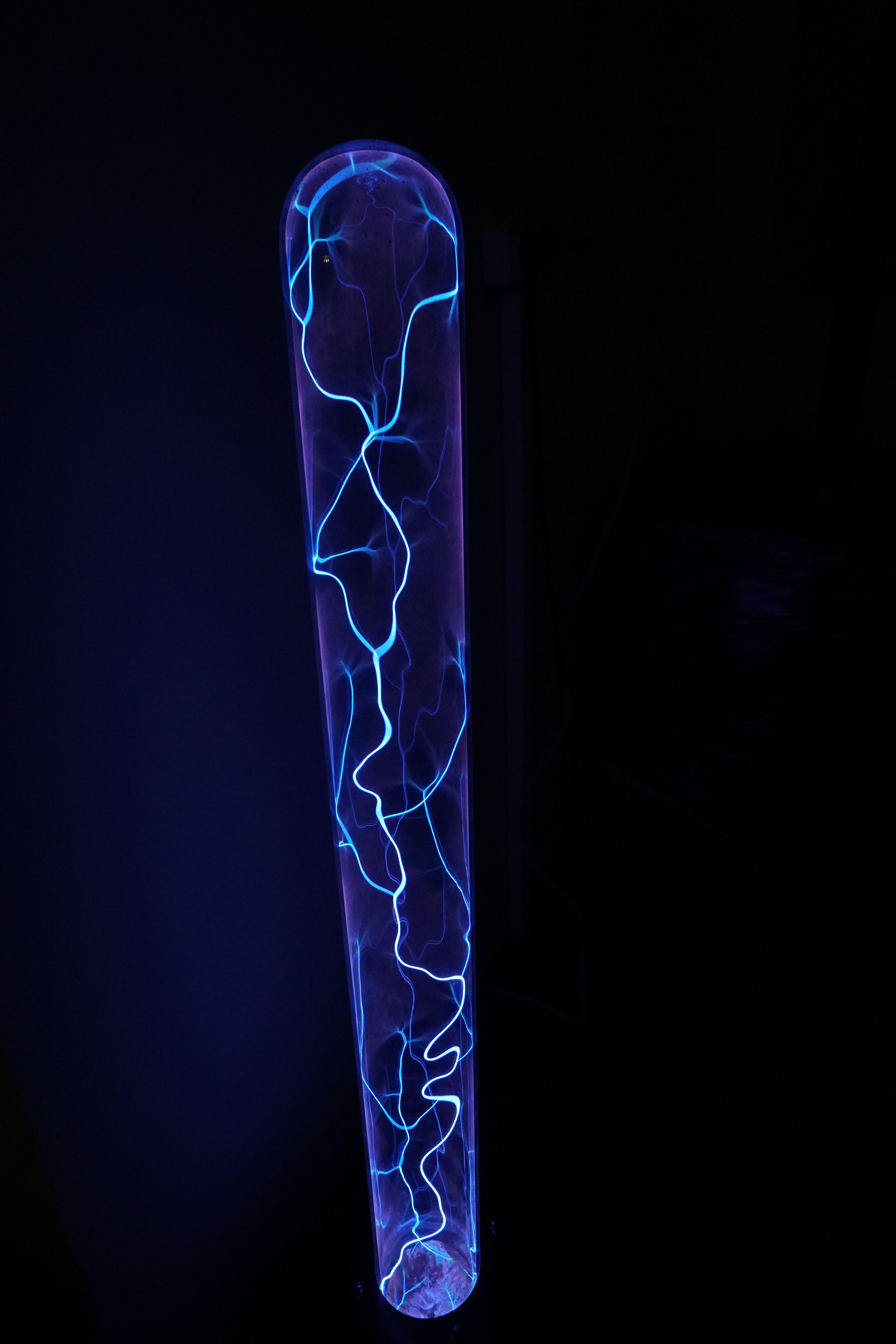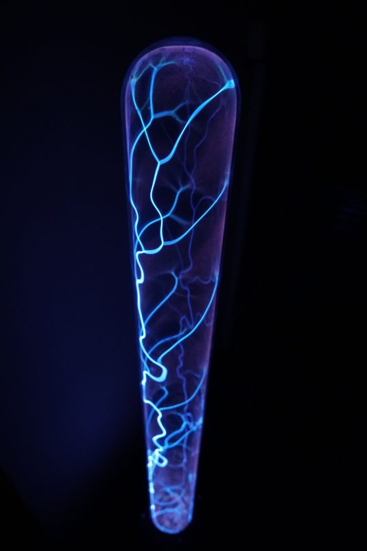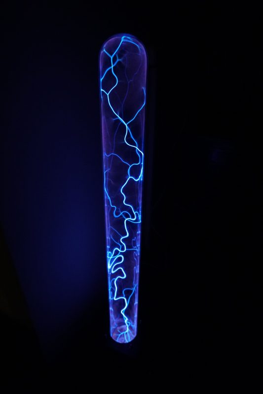 Синие жгуты с зелеными всполохами удивительно спокойное и приятное сочетание. Как морская гроза у Вас в руках, и невозможно отвернуться, пораженный природной силой и красотой стихии. Ток, текущий за стеклом, безопасен и реагирует на Ваши прикосновения, меняет своё поведение, будто слушаясь Вашей воли.