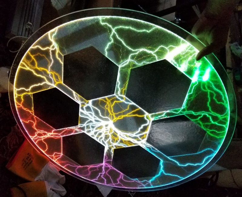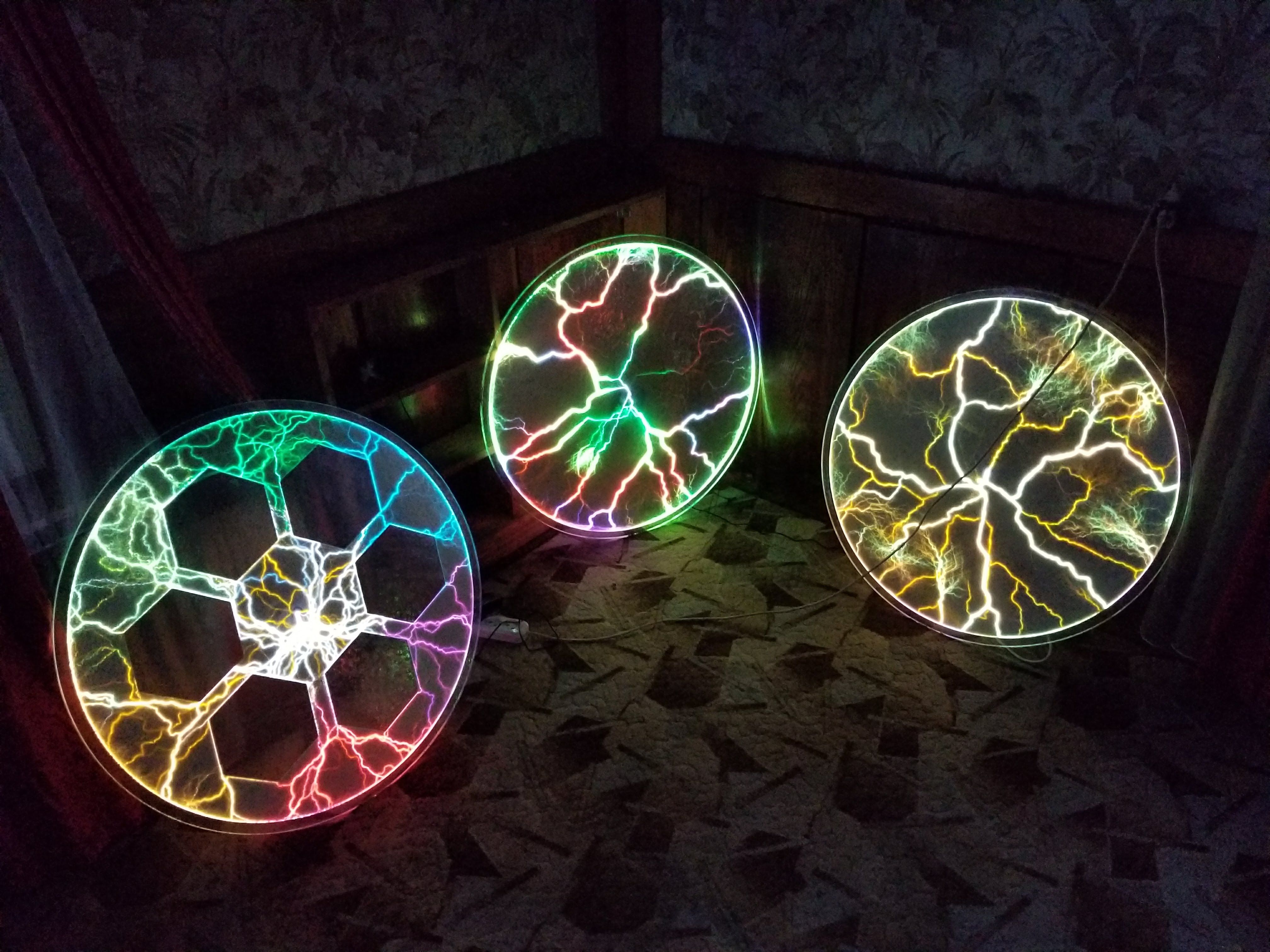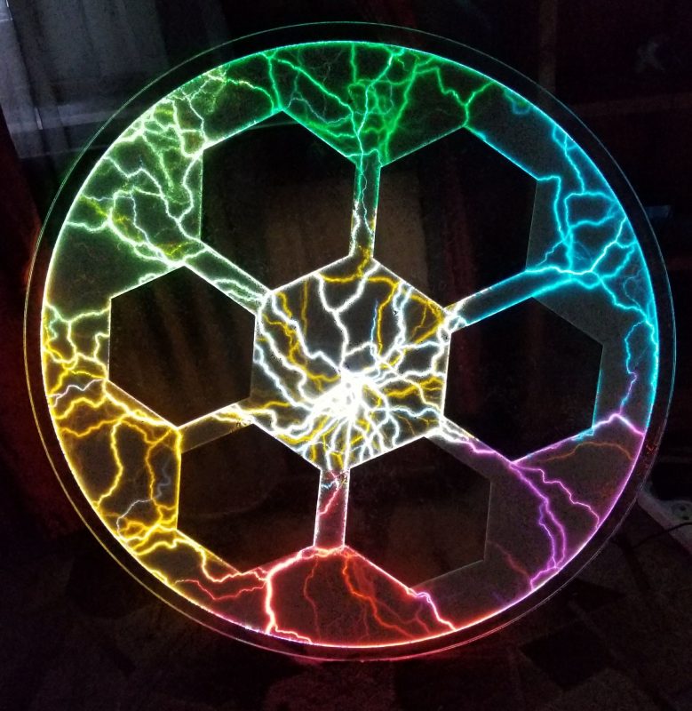 Огромный плазменный диск 80 см в диаметре с шестиугольными вставками-сотами. Разряды «обходят» соты стороной, создавая потрясающую картину.